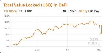 Очень показательный факт - приведённая выше новость от 7 октября отлично иллюстрируется слайд-шоу от .... 4 ноября. Да, это уже не первый сильный завал "капитализации" DeFi; за последние 2 месяца (сентябрь-октябрь) это уже как минимум третье или четвёртое крупное падение в DeFi-секторе.