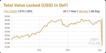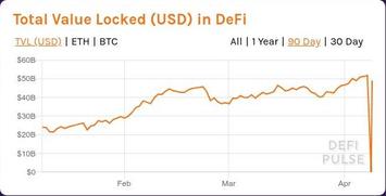 Казалось бы, 2 сильных сбоя подряд в течение короткого промежутка времени - это более чем достаточно, и третьего подобного сбоя в ближайшее время ждать не следует. Тем не менее, День Сурка повторился уже 8-9 апреля, причём в этот раз DefiPulse как-то сумел зафиксировать обвал TVL до нуля.